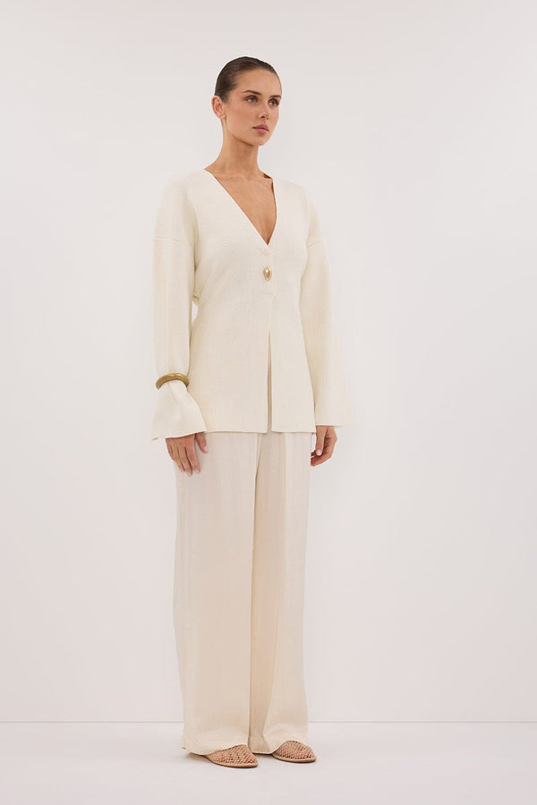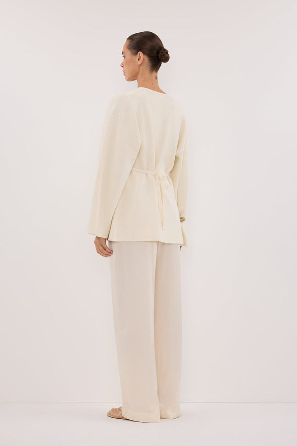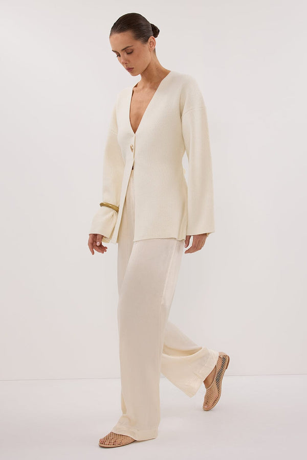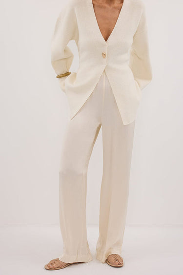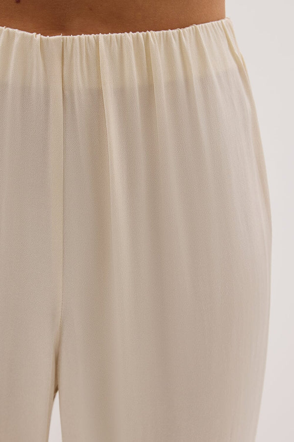 High rise tall satin pant. Wide internal elasticated waistband. Gathering at waistband. Designed for a relaxed, straight leg silhouette. Please see studio image for most accurate colour.
